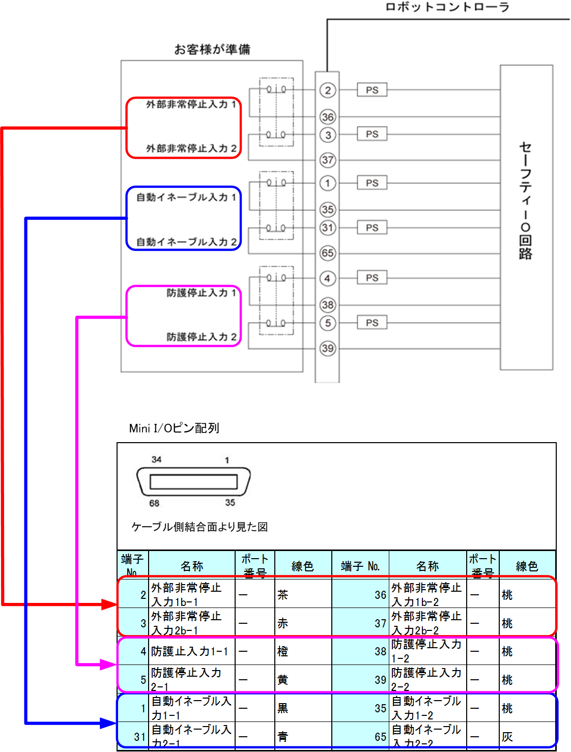 「外部非常停止入力」、「自動イネーブル入力」、「防護停止入力」を短絡します。