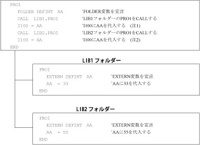 FOLDERステートメントでローカル変数を宣言すると、ローカル変数を外部のプログラムからEXTERNステートメントを使用して参照可能となります。