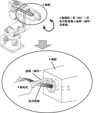 请注意,如果省略以上步骤,则4轴的CALSET位置可能错误旋转1圈(360°),此时将导致机内配线卷入曲柄并断线。