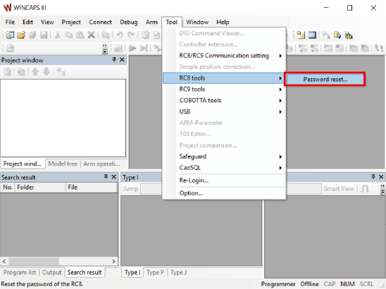 从“工具”菜单的“RC8工具”中按“重置密码”。