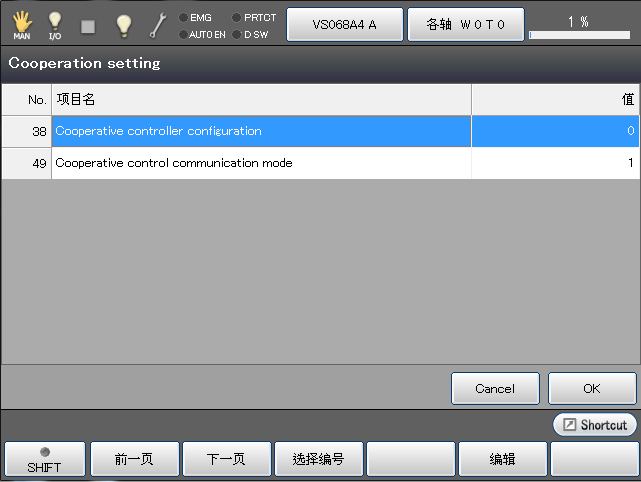 当机器人控制器的软件版本为2.3.*以上时,1:将“并用Ethernet与EtherCAT”设为默认。 只使用Ethernet时,请将协调控制通信模式的值改为“0”。 |