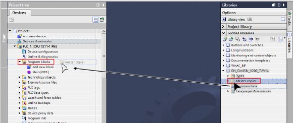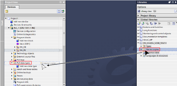 将库中的“主复制”拖放到项目的“PLC数据类型”中。