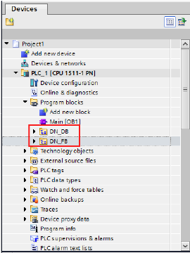将在“程序块”中创建“DN_DB”和“DN_FB”文件。