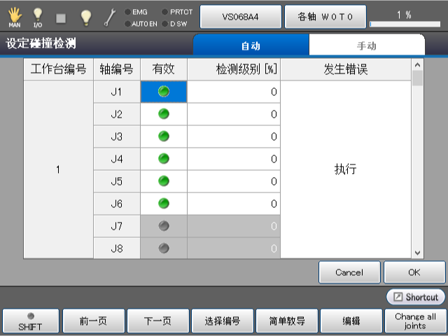 按轴设定碰撞检测功能的有效/无效、检测级别。此外,设定自动时有无发生错误。