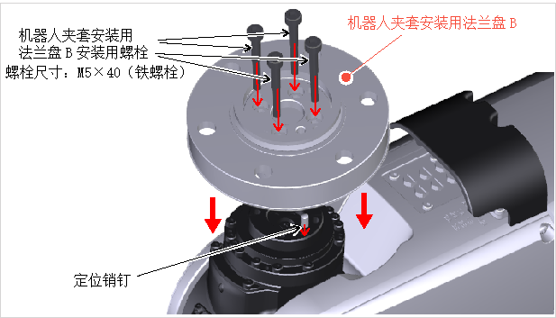 请用附带的螺栓及定位销固定机器人夹套安装用法兰B。