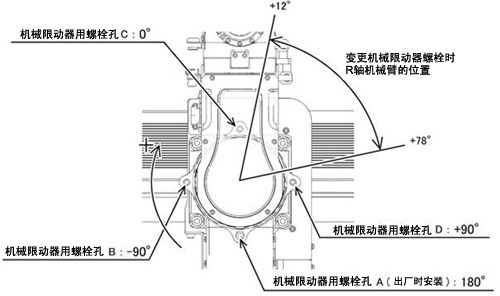 XR系列机器人的第2轴(R轴)上设有4个机械限动器用螺栓孔。参考以下步骤,正确设定第2轴(R轴)的可运行范围和机械限动器。