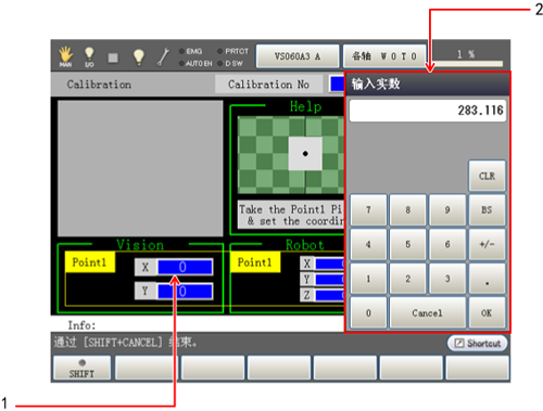 如果触摸1的坐标部分,则显示2的数值输入画面。输入视觉装置中读取的视觉坐标(X,Y),按下[OK]按钮。