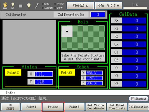 如果按下[Point 2]按钮,可注册第2处的视觉坐标、机器人坐标。