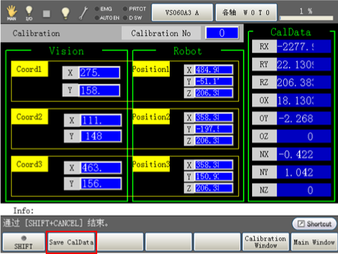 如果按下[Calibration]按钮,则根据注册的点1~3的数据计算CalData,并在CalData中显示结果。