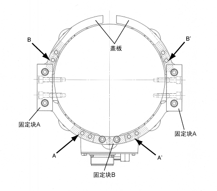 进行机械末端变更时,需要机械末端变更零部件(限制器、固定块A(2个)、固定块B、盖板(2个)4类)。由于列出了限制器、固定块A、固定块B、盖板的参考图纸,用户可任意设定可运行范围并根据需要进行制作。