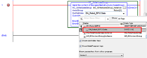 为OutAddress指定通过EtherNet/IP通信设定生成的输出标签。(下图的例子选择“DN_Robot_EIP:O.Data”。)