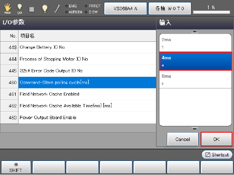 在I/O参数画面中选择“No.460 : Command-Slave 查询周期[ms]”,按[F5 编辑]。