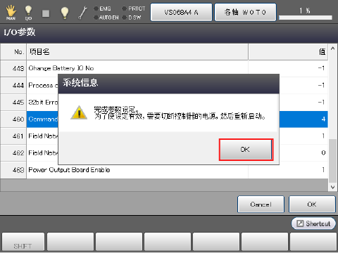参数设定完成后,将显示以下系统信息,请按“OK”,重新启动机器人控制器。