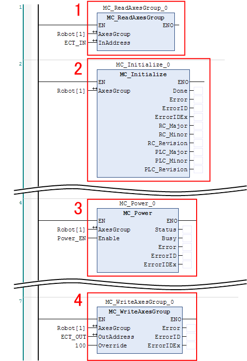 从机器人控制器获取机器人的动作状况等的数据,存储在“AxesGroup”中。通过这个FB获取的数据用于通过Command-Slave的其他FB控制机器人。