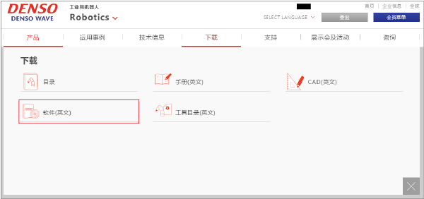 从下述URL访问DENSO WAVE机器人网站,点击画面右上方的“登录”。