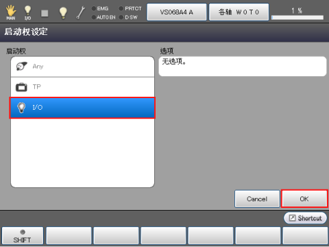 在多功能教导器上进行启动权的设定。有效化Command-Slave功能时,将启动权设为“I/O”。设定步骤如下所示。