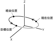 現在位置、経由位置、目標位置の3点で描かれる円弧に沿いながらロボットが経由位置、目標位置の順に移動します。