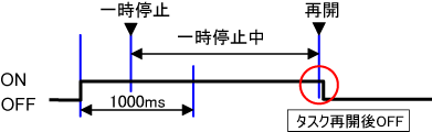 | 1 | 一時停止中はOFFしないモード | 一時停止中も経過時間はカウントアップされますが、一時停止中に出力時間に達してもOFFしません。再び、タスクを動作させた時にOFFします。