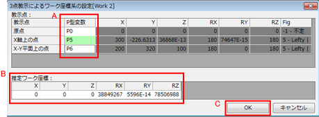 教示点から、ワーク座標が計算できると、計算結果が表示され、[OK]ボタンが有効になります。