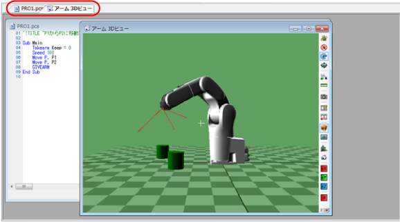クライアント領域には、プログラムやヘッダファイルを編集する「プログラム編集ウインドウ」や、ロボットの姿勢を3D表示する「アーム3Dビュー」、各種ログ画面等が表示されます。