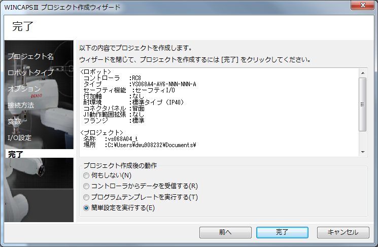 手順最後の「プロジェクト作成後の操作」を「簡単設定を実行する」にチェックを入れ[完了]を押します。
