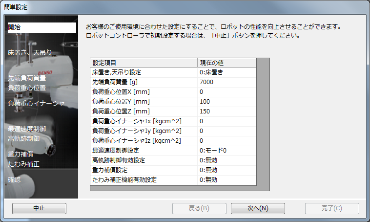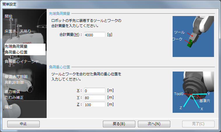 「先端負荷質量」と「負荷重心位置」の設定を行います。