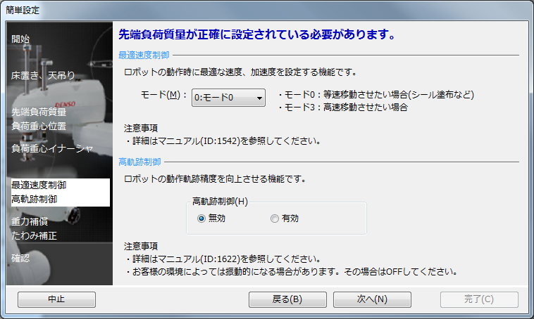 「最適速度制御」と「高軌跡制御」を設定します。