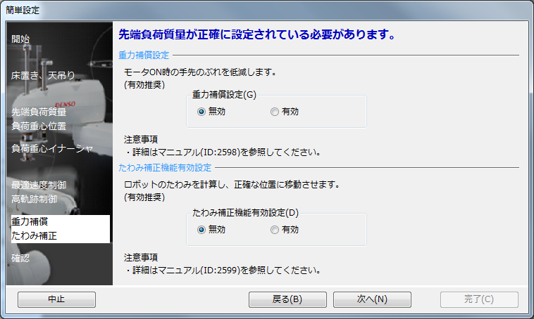 「重力補償設定」と「たわみ補正機能有効設定」を設定します。