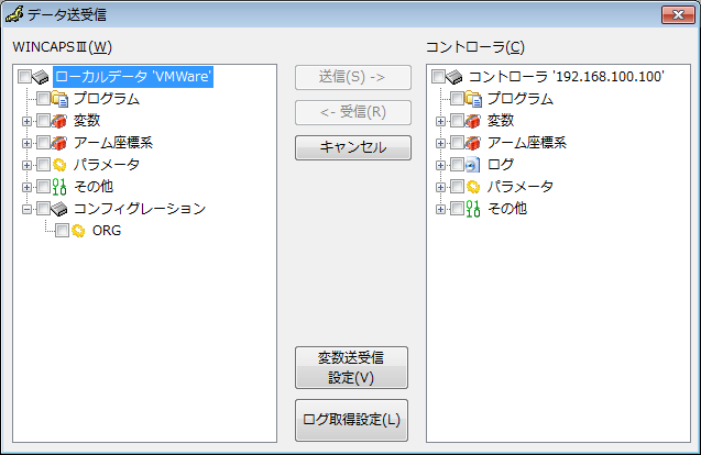 データを送信する場合は、「WINCAPSIII」側、データを受信する場合は「コントローラ」側のチェックボックスを「ON」にしてください。