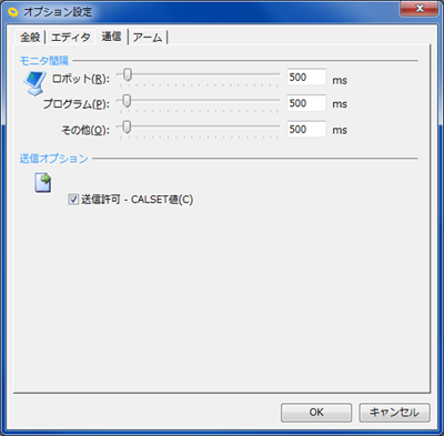 間違ったデータがロボットに送信され、教示位置がずれる恐れがありますので、通常の作業時は[送信オプション]内の[送信許可-CALSET値]のチェックを外してください。