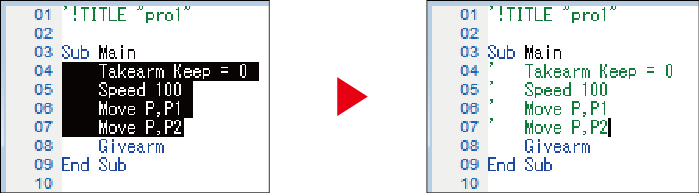 コメントブロックを解除する場合は、コメント行を選択して「コメントブロック」/「選択範囲のコメント解除」を選択してください。