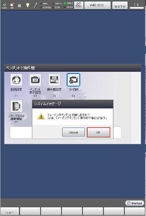 操作経路 : [F6 設定] - [F3 ペンダントと操作盤] - [F4 TP切断]