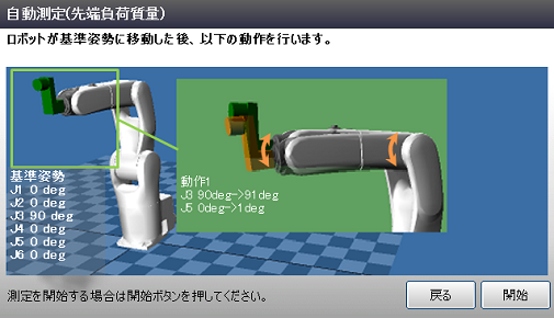 負荷推定機能とは、ロボットに特定の動作を行わせることで、先端負荷の質量と重心を推定する機能です。この機能は簡単設定の "先端負荷質量" と "先端負荷重心" の入力時に使用することができます。