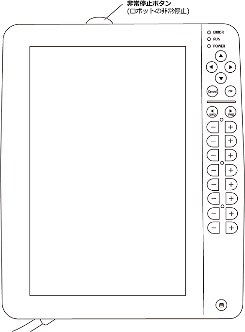 非常停止を押すと、実行中の全プログラムが瞬時に中断されて、モータ電源が切れることによりロボットが停止します。
