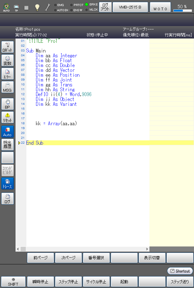 下に記載したのは、ログボタンで3行目をログ開始行に、22行目をログ停止行に設定し、プログラムを実行した画面です。