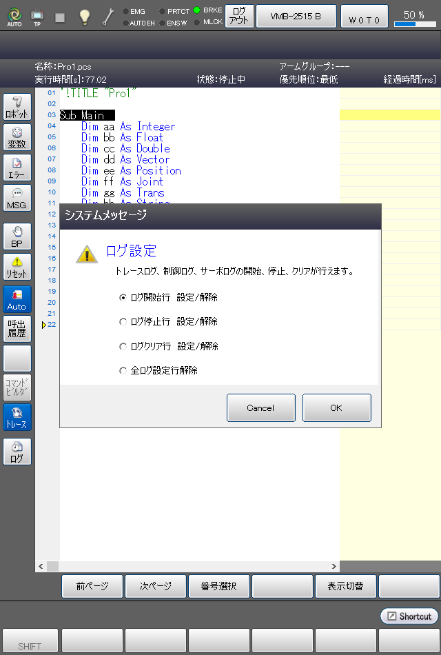 SysLog.Trace.Start、SysLog.Trace.Stopコマンドを使用せずに、プログラムの内容表示画面上で、[ログ]ボタンを使用して、ログの記録開始、終了を指定することができます。