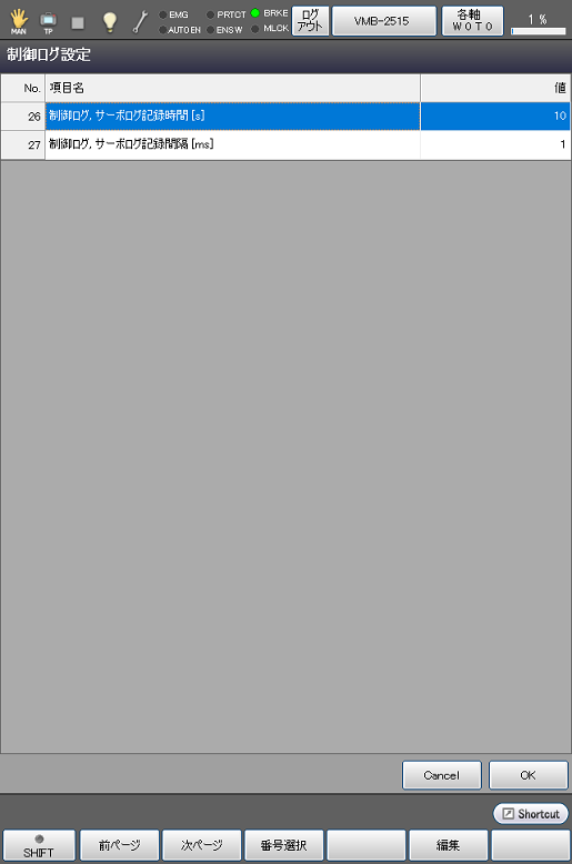 | 制御ログ, サーボログ記録間隔 | ms | 1 | 制御ログとサーボログの記録間隔を設定します。 |