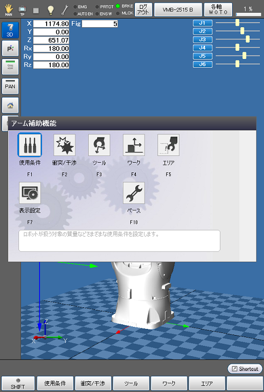 ロボットを動かす上での様々な使用条件の設定、"ツール座標" や "ワーク座標"、"エリア"の設定などを行うメニューが表示されます。