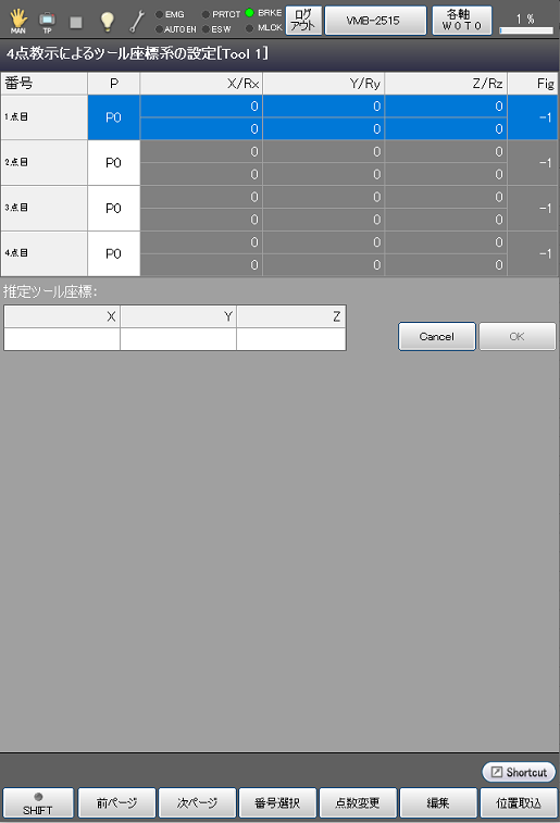 [F4 簡単教示]を押すと、次のような[※点教示によるツール座標系の設定]画面が表示されます。(図は、教示ポイントを4点とした場合の例です。)