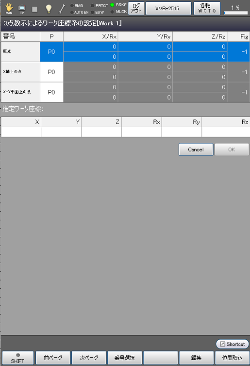 [F4 簡単教示]を押すと、次のような[3点教示によるワーク座標系の設定]画面が表示されます。