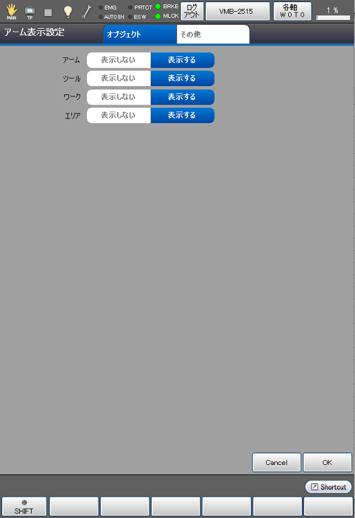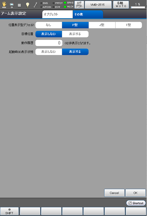 [起動時3D表示状態]はコントローラ起動時にアーム画面の3D表示をするかしないかを設定します。