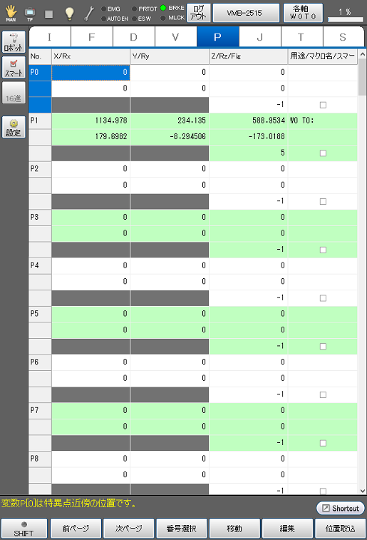 | [F6 位置取込] | ロボットの現在位置を指定した変数に取込みます。 J型、T型、P型の変数の場合のみ操作できます。 |