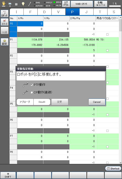 目標の座標値までロボットを動かす上で、[PTP動作]で移動するのか、[CP動作(直線)]で移動するのかを選択します。