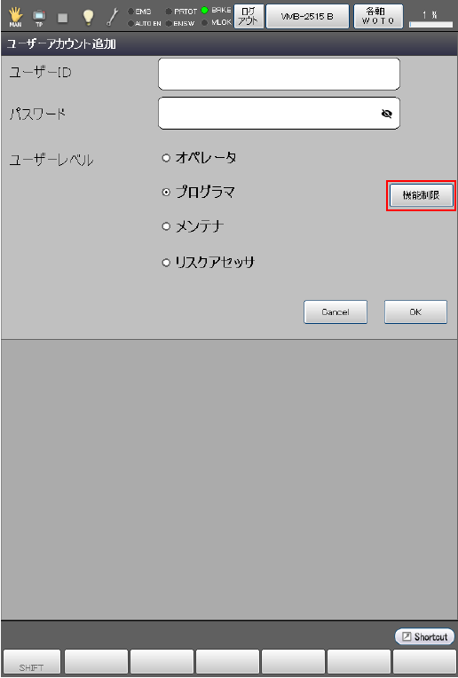 ユーザアカウント追加、ユーザアカウント情報変更のどちらかで[プログラマ]を選択し、赤枠内の機能制限ボタンを押してください