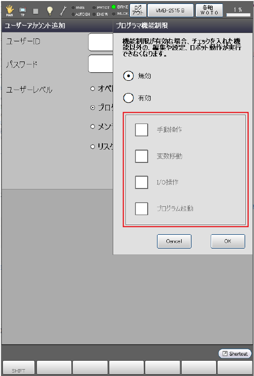 プログラマ(機能制限)では、下記のロボット動作に関連する4つの機能について、ユーザレベル設定時に機能の利用の許可、不許可を設定可能です。