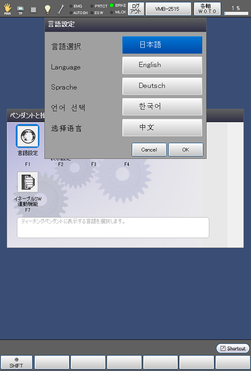操作経路 : [F6 設定] - [F3 ペンダントと操作盤] - [F1 言語設定]