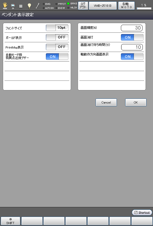操作経路 : [F6 設定] - [F3 ペンダントと操作盤] - [F2 ペンダント表示設定]