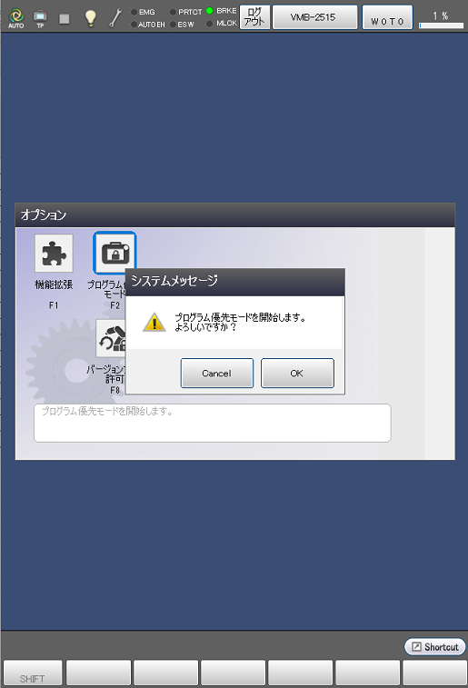 [F2 プログラム優先モード]ボタンを押すと[システムメッセージ]ウィンドウが表示されます。