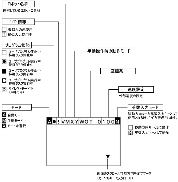 ミニペンダントが電源入り状態になると、基本画面が表示されます。この画面の最上段にはステータスバーがあり、現在の動作モード、プログラムの状態、接続ロボットのモデル、速度などの情報を常時表示しています。