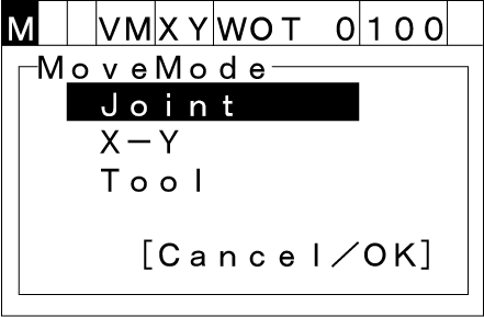 手動動作にて、使用したい動作モードを上下カーソルキーを使って、"Joint"、"X-Y"、"Tool"から選択し、[OK]を押して動作モードを変更します。
